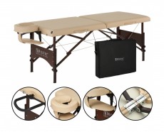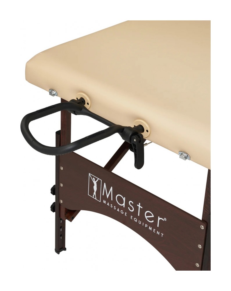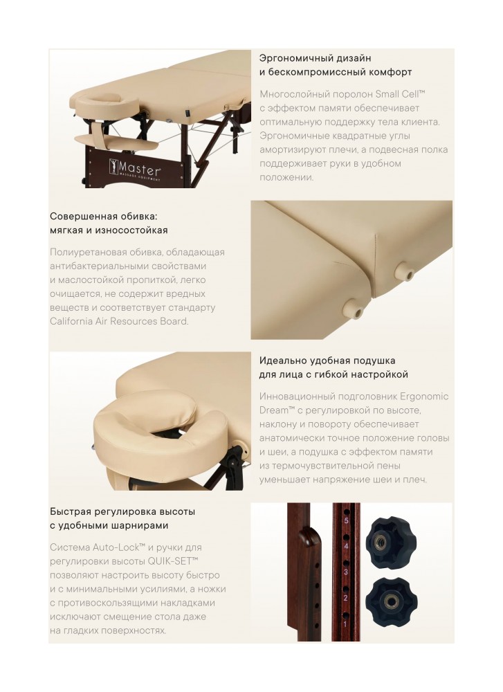 Универсальный складной массажный стол Master Massage Argo шириной 71 см Наш универсальный переносной стол Argo шириной 71 см подходит как для массажа, так и для тренировок на столе. 4-сантиметровый наполнитель Small Cell Foam обеспечивает комфорт и поддержку, позволяя выполнять аэробные и анаэробные упражнения прямо на поверхности стола, не опускаясь на пол. Ваш клиент или близкий человек может насладиться расслабляющим массажем, а вы — улучшить гибкость и укрепить мышцы всего тела, не нагружая позвоночник во время растяжек. Несмотря на малый вес — всего около 13,6 кг — складной стол Argo отличается прочностью и удобством. Он оснащён мягкой обивкой из полиуретана, устойчивого к маслам и влаге.  Надёжная конструкция стола выдерживает нагрузку до 204 кг. Стол легко раскладывается за считанные секунды благодаря системе автоматической фиксации ножек Auto-Lock. Ножки изготовлены из европейского бука с ореховым покрытием и защищены прочным лаком Dura Seal. Всё используемое дерево не содержит формальдегида и канцерогенов, соответствуя экологическим стандартам Калифорнийского совета по качеству воздуха (CARB).