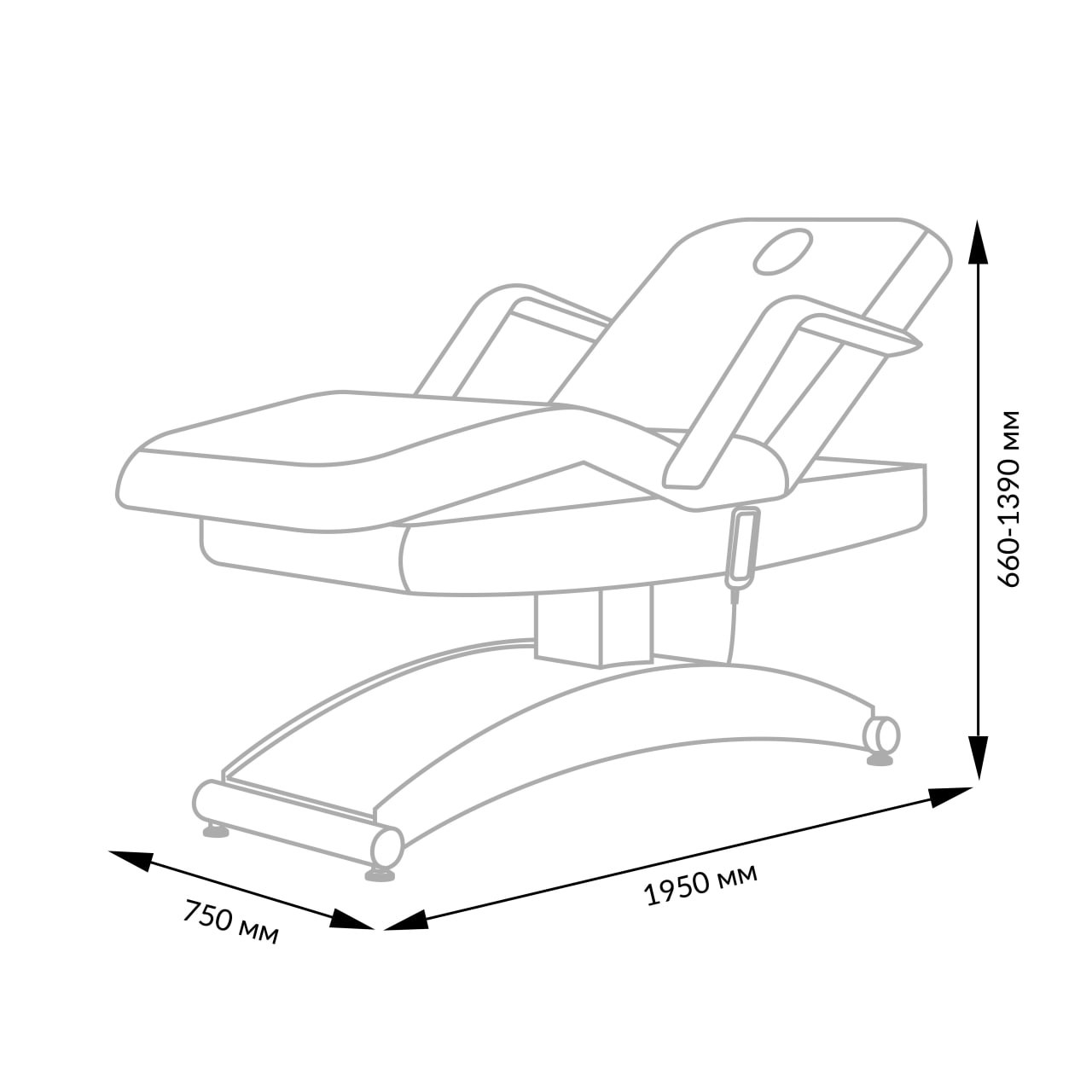 Комплектация: кушетка, подлокотники, съемная подушка, элементы каркаса и основания, электропривод с тремя электромоторами и дистанционным пультом управления.